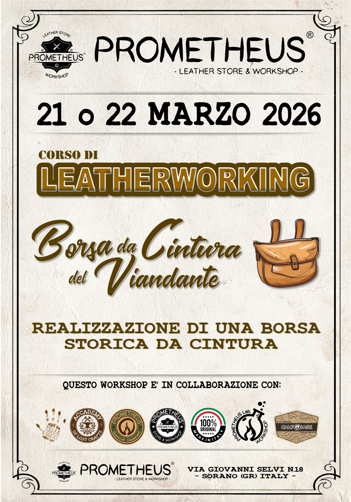 Vuoi regalare o vivere un’esperienza esclusiva e completamente personalizzata? Scopri il fascino di un CORSO PRIVATO One2One, un viaggio immersivo nell’arte della pelletteria, dove ogni momento è dedicato a te. Sotto la guida attenta del nostro maestro artigiano, potrai apprendere le tecniche più raffinate, dare forma alla tua creatività e realizzare un pezzo unico, frutto della tua visione e del tuo talento. Il tutto avvolto nell’atmosfera suggestiva del nostro laboratorio, nel cuore del borgo medievale di Sorano. Un’opportunità irripetibile per chi desidera approfondire, sperimentare e perfezionare le proprie abilità in un ambiente intimo e ispirante, dove l’artigianato incontra l’arte. Contattaci ora per riservare la tua esperienza su misura: info@prometheus-leatherwork.com