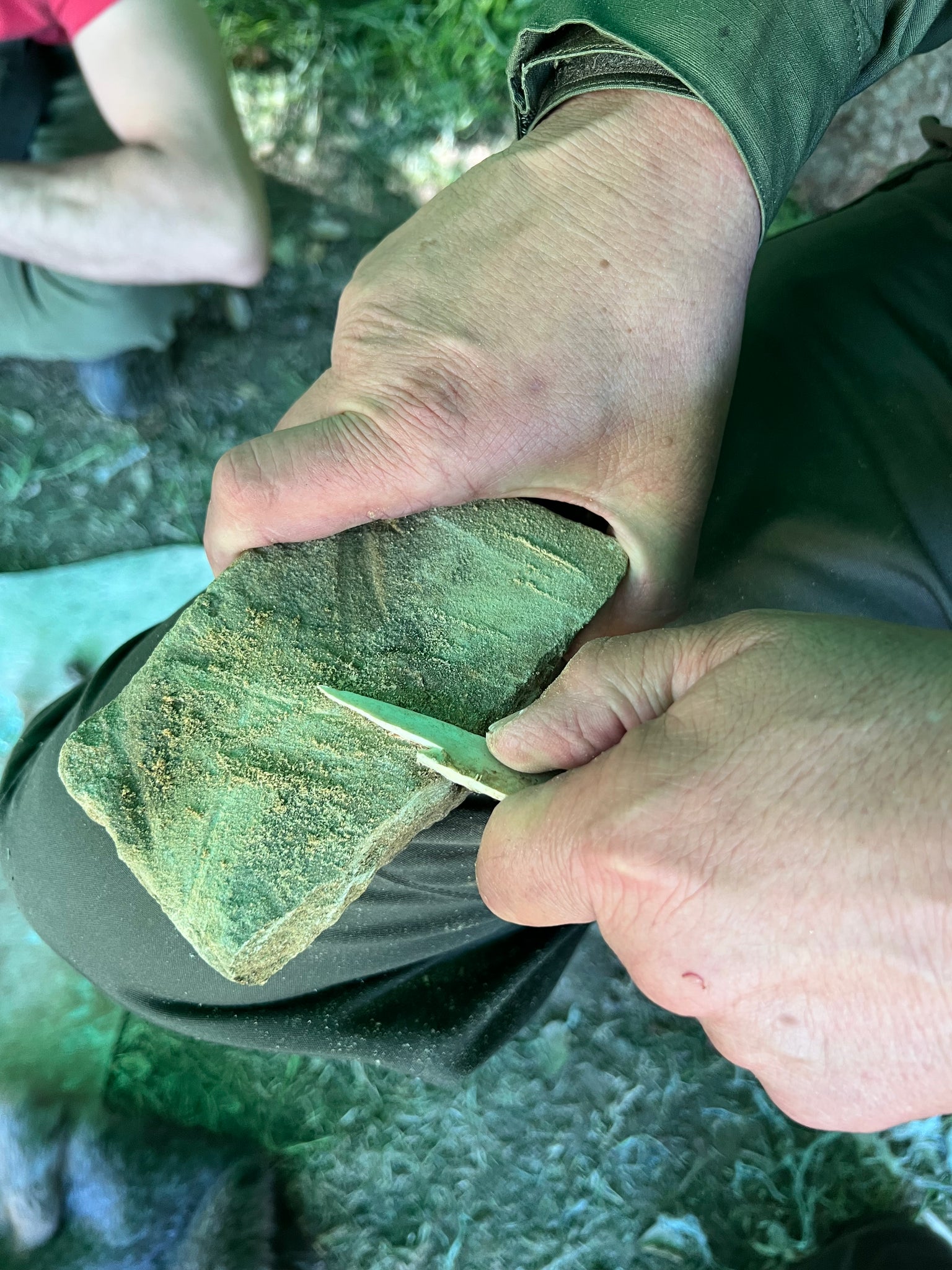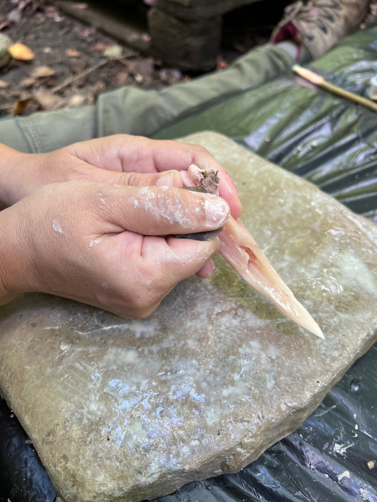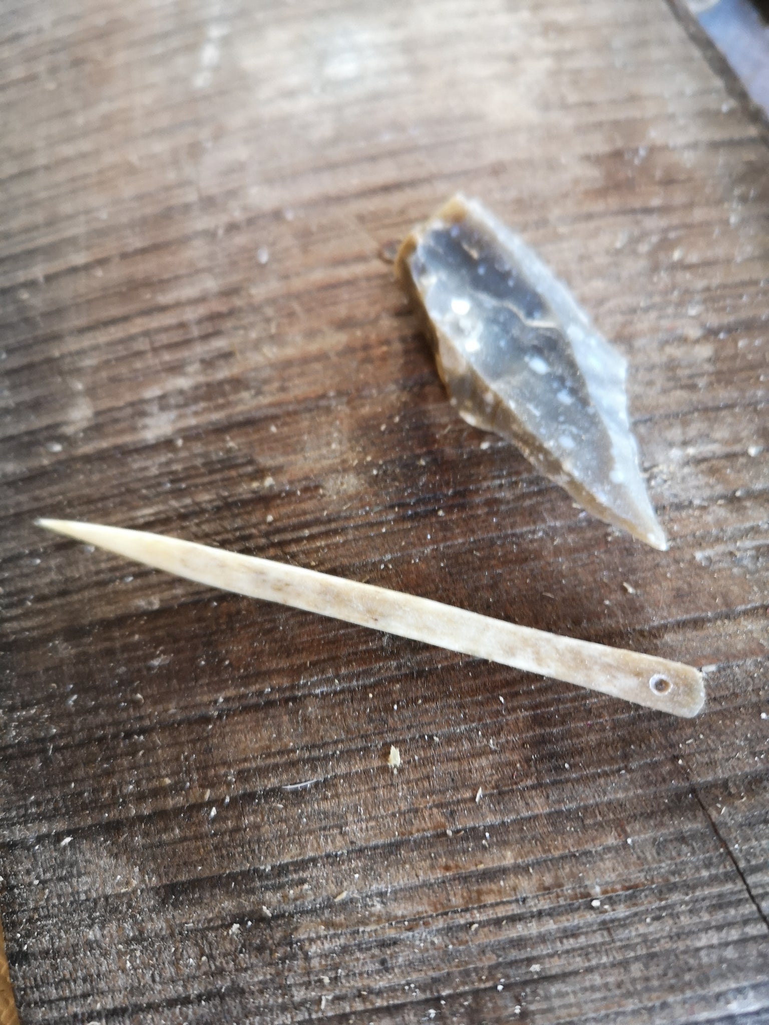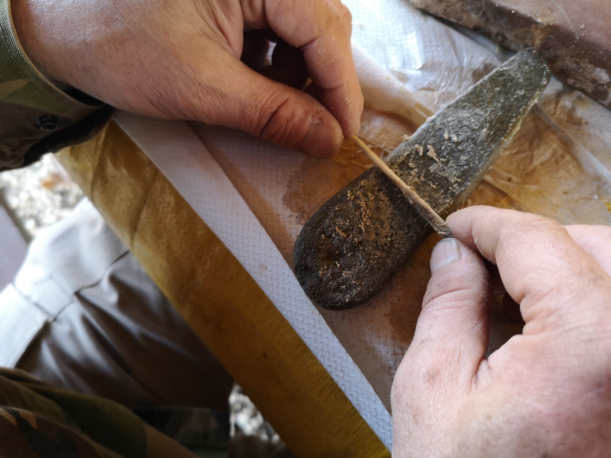Lavorazione delle ossa – levigatura su pietra per la creazione di strumenti primitivi come lesine e aghi, fondamentali per la produzione autonoma di utensili.
